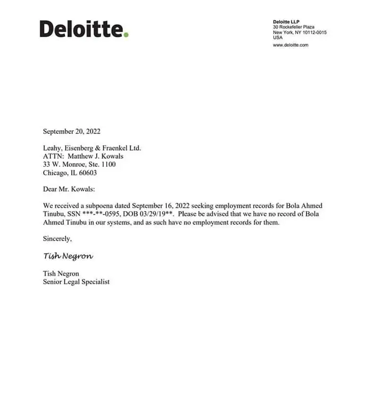 According to the information in the document, Deloitte denied having the record of Bola Tinubu in it’s data base.