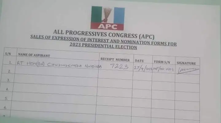 The Minister of State for Education, Chukwuemeka Nwajiuba has finally joined the long list of political gladiators gunning to takeover leadership baton from president Muhammedu Buhari, as he officially picks nomination and Expression of Interest forms of the All-Progressive Congress (APC).