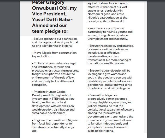 A further perusal of the document showed that Obi and his running mate, Yusuf Datti-Ahmed, promised to among others: